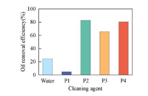 為探究表面活性劑在清洗領(lǐng)域的應(yīng)用,測(cè)試了4種表面活性劑對(duì)油污的去除能力。在超聲清洗之前,油污的質(zhì)量為41 mg.超聲清洗后,去離子水除去10 mg油污,去污效率為24.4%;P1由于溶解性差,在水溶液中大部分都不能溶解,導(dǎo)致去污效率很差,僅為4.9%;P2,P3和P4分別除去34,27和33 mg油污,去污效率分別達(dá)到82.9%,65.8%和80.5%,遠(yuǎn)遠(yuǎn)高于去離子水的去污效率(圖9)。因此,P2,P3和P4表面活性劑有著良好的去污性能,進(jìn)一步說(shuō)明其在清洗領(lǐng)域有巨大的應(yīng)用潛力。