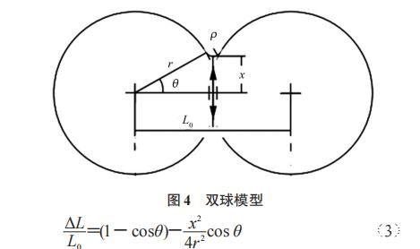 電子束熔粉與激光熔粉不同,因為電子束是以帶電粒子的定向運動產(chǎn)生的動能作為能量來源的,所以必須有導電回路才能不斷地轟擊工件。但粉末層是孔隙材料,導電性較差,因此在電子束接觸粉末的瞬間可能出現(xiàn)靜電潰散現(xiàn)象。為了確定熔粉初期的工藝模式,文章選用了雙球模型,計算不發(fā)生靜電潰散時的臨界線收縮量,結構模型如圖4所示。計算公式如式(3)。