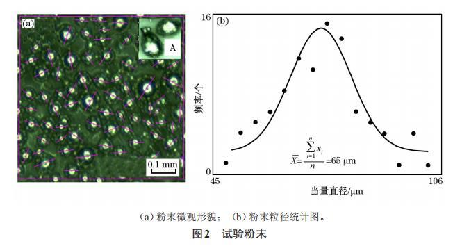 本文以不銹鋼316L(022Cr17Ni12Mo2)球粉為成形原料,顆粒直徑為45~106μm(如圖2所示)【316L不銹鋼的微觀組織:相鄰熔覆道之間的搭接良好。組織主要由胞狀晶和呈外延生長的柱狀晶組成,柱狀晶的取向各不相同。由于熔池邊界處粉末未熔化區(qū)域溫度較低,因此一部分晶粒沿著熔池邊界外延生長,同時在SLM過程中,熔池內(nèi)部經(jīng)歷快速冷卻,表面張力形成梯度,熔池內(nèi)部存在“馬戈紊流”,熔池內(nèi)發(fā)生對流,導致熔池內(nèi)部散熱方向發(fā)生改變,因此,造成晶粒顯示出不同的生長方向。胞狀晶呈正六邊形,為柱狀晶的截面,柱狀晶晶粒十分細小,直徑分布在0.4~0.7μm。】,根據(jù)筆者已有的研究結果選擇合適的工藝,詮釋顆粒群的熔合線收縮和再結晶過程。由于試驗粉末顆粒直徑分布廣,為了建立粉末計算模型,用式(1)、(2)計算了顆粒群的當量直徑d和算術平均直徑d。