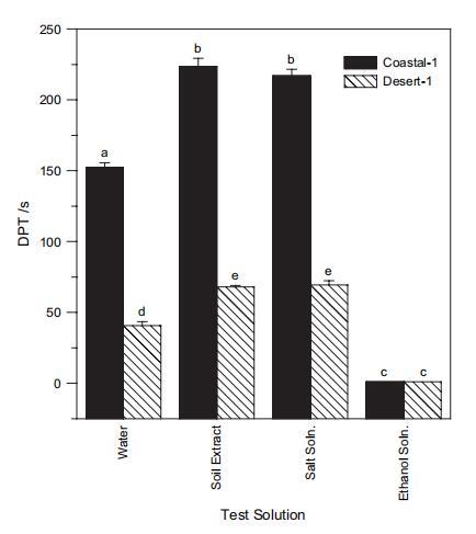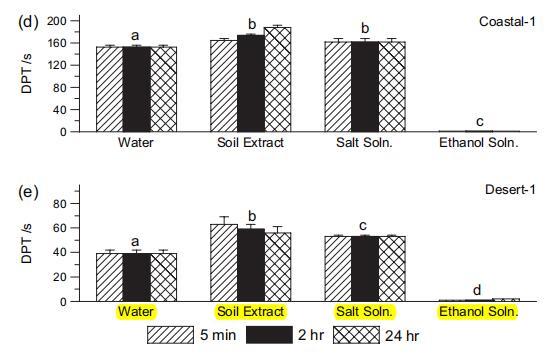 圖 4 水滴滲透時間 (DPT),2:1 w : w 2 小時 用于 Desert-1 和 沿海 1 土壤。 誤差棒顯示重復(fù)的標(biāo)準(zhǔn)偏差 滴。 小寫字母給出了兩側(cè) t 檢驗的結(jié)果。 不同字母表示均值在 P ? 0.01 顯著性水平。