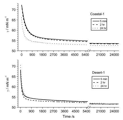 1:1 提取物的動態(tài)表面張力測量 表明達(dá)到平衡的時間 γLV 從大約 15 分鐘到長達(dá) 5 小時不等(圖 1)。 在所有情況下,都有一個相對較快的初始速度 γLV 的變化,這可能是擴(kuò)散受限的,和 然后是一段長時間的低利率 γLV 的變化。 平衡達(dá)到率低的時期被假定為至少兩個過程的結(jié)果:(i)不同分子之間的表面競爭 吸附位點; (ii) 表面分子的重排。 時間之間沒有明顯的關(guān)系 實現(xiàn)不同的平衡 γLV 和提取時間 土壤(圖 1)。
