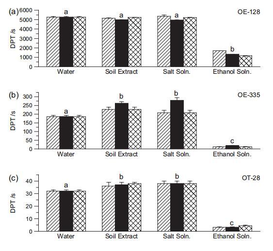 圖 3 液滴穿透時間 (DPT) 水、1:1 土壤提取物、鹽溶液和不同土壤的乙醇溶液:(a) OE-128; (b) OE-335; (c) OT-28; (d) Coastal-1; (e) 沙漠-1。 誤差線顯示標(biāo)準(zhǔn)偏差 復(fù)制滴。 小寫字母給出 兩側(cè) t 檢驗的結(jié)果。 在給定的 窗格中,不同的字母表示均值 在 P ? 0.01 顯著差異 癌癥水平。 對于 t 檢驗,結(jié)果為 三個提取時間(5 分鐘、2 小時和 24 小時)一起考慮,因為它們的 γLV 值非常相似(圖 2b)。
