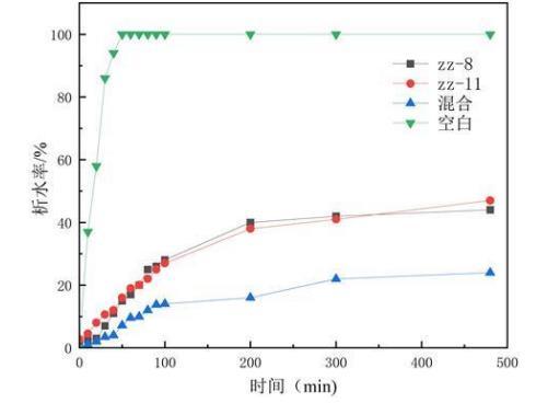 圖5是實(shí)施例1乳化性能測試中ZZ-11、ZZ-8、混合菌劑析水率曲線圖。