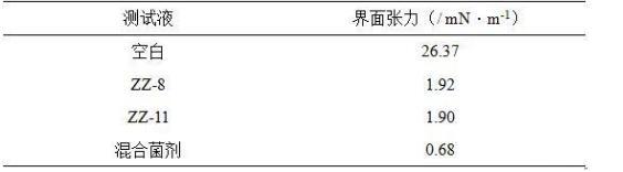 表面張力是洗油劑對原油洗脫能力的重要指標(biāo),數(shù)值越低、洗脫能力越強(qiáng)。測試結(jié)果顯示解淀粉芽孢桿菌(Bacillus amyloliquefaciens)ZZ-11和膠凍樣芽孢桿菌(Bacillus mucilaginosus)ZZ-8發(fā)酵上清液均能降低表面張力,混合菌劑發(fā)酵上清液的表面張力值更低。