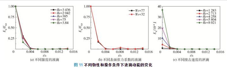 圖11(b)為水和乙醇液滴在撞擊過程中動能隨時間的變化。可以看出,液滴在鋪展過程中動能的減小量和減小的速率不隨表面張力系數(shù)而變化。