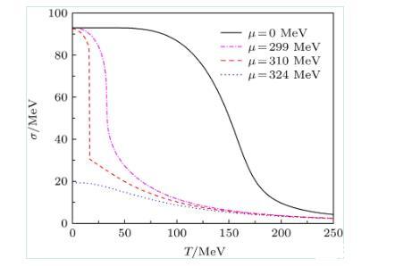 圖1在不同夸克化學(xué)勢(shì)密度條件下,σ場(chǎng)的真空期望值隨溫度的演化行為
