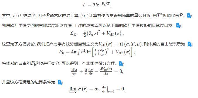 在偽真空的環(huán)境下,大小不一的真真空泡泡,由于量子漲落和熱漲落隨機(jī)出現(xiàn)并消失,直至泡泡的半徑大于等于臨界半徑,然后這些泡泡就會(huì)一直膨脹下去,完成一級(jí)相變的相變過(guò)程,并把多余的體系自由能以相變潛熱的形式釋放到環(huán)境中。基于這個(gè)機(jī)制,單位時(shí)間單位體積的臨界泡泡成核率可以表示為