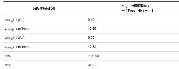 由前文實(shí)驗(yàn)結(jié)果可知,三七根提取物與Tween 60的cmc均為0.1 g/L。根據(jù)2.3.2中方法,確定了三七根提取物與Tween 60復(fù)配質(zhì)量比為1∶1。在25℃下,復(fù)配體系理論值和表觀值如表3所示。三七根提取物與Tween 60的復(fù)配體系形成膠束的能力減效100%,降低溶液表面張力的能力減效0.51%。結(jié)果表明,三七根提取物與Tween 60按1∶1質(zhì)量比復(fù)配后,并不能對(duì)體系產(chǎn)生明顯的協(xié)同增效作用,這可能與三七根提取物和Tween 60的含量、結(jié)構(gòu)有關(guān)。