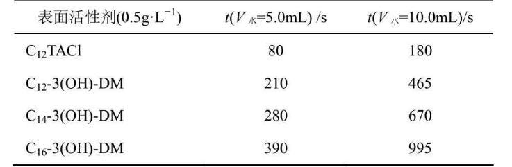 采用量筒法進行表面活性劑乳化力的測定,結果見表4。雙子表面活性劑比傳統(tǒng)單子表面活性劑十二烷基三甲基氯化銨[1-2,22]分出相同體積水的時間長,且隨著烷基碳鏈長度的增加,水相所分離出水量所用的時間也越長。這可能是因為在油/水界面上,吸附的表面活性劑分子之間排列越緊密,形成界面的膜強度越高。根據單分子吸附膜理論,界面張力減小,乳化性能越好,表現為從乳狀液中分離出水所用的時間越長。隨著烷基碳鏈長度的增加,碳氫鏈間的相互作用力更強,兩個表面活性劑單體分子之間的連接更加緊密,形成的界面膜強度也越高,因此烷基碳鏈長度越長的雙子表面活性劑的乳化效果越好。