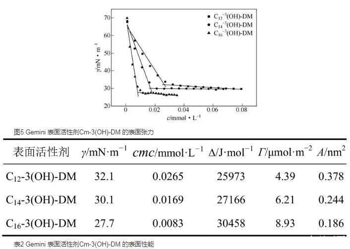 (2)測定了Cm-3(OH)-DM在水溶液中的表面張力、cmc以及其熱力學常數,得到其cmc分別為0.0265mmol/L、0.0169mmol/L、0.0083mmol/L,γcmc分別為32.1mN/m、30.1mN/m、27.7mN/m。以上數據表明與對應的傳統(tǒng)單子表面活性劑相比,Gemini表面活性劑Cm-3(OH)-DM(m=12,14,16)具有很好的表界面活性。