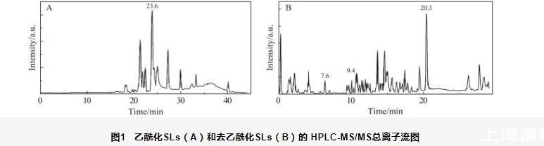 圖1乙酰化SLs(A)和去乙酰化SLs(B)的HPLC-MS/MS總離子流圖
