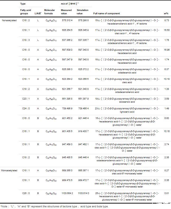 表1乙酰化SLs同系物組分和質(zhì)量分數(shù)(Continued from previous page)