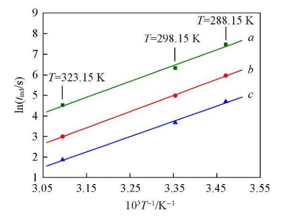將圖1與圖4對(duì)比可知,添加NaCl后Li2CO3的成核誘導(dǎo)期明顯增長(zhǎng),說明體系中過量Cl?的存在抑制了Li2CO3的成核.用圖4中的實(shí)驗(yàn)數(shù)據(jù)回歸了式(8)中的參數(shù)數(shù)值,結(jié)果列于表3.由回歸的參數(shù)數(shù)值可知,過飽和度對(duì)誘導(dǎo)期的影響仍然是在較低的溫度下更為顯著.