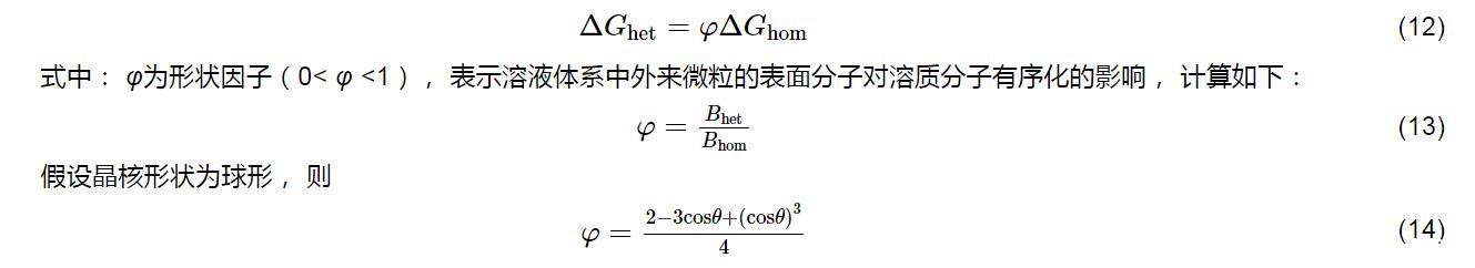 式中:θ為晶核與外來固態(tài)雜質(zhì)之間的接觸角(0°≤θ≤180°),反映晶核與外來雜質(zhì)之間的親和程度,從而決定外來雜質(zhì)對(duì)初級(jí)成核的影響.