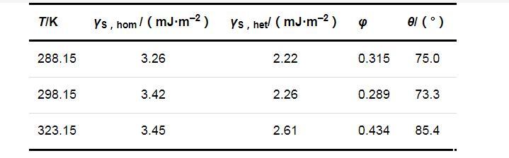 兩種成核機(jī)制時(shí)的固-液界面張力(γS,hom和γS,het)、形狀因子(φ)和接觸角(θ)的計(jì)算結(jié)果列于表2.可以看出,在同一溫度下,均相成核時(shí)的固-液界面張力大于非均相成核時(shí)的固-液界面張力;溫度對(duì)固-液界面張力的影響并不明顯,固-液界面張力只隨溫度的升高略有增加.