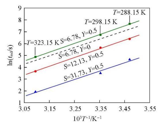 分別在288.15,298.15和323.15 K時(shí)研究了NaCl的添加對(duì)Li2CO3成核誘導(dǎo)期的影響,每組實(shí)驗(yàn)均在Cl?的超額含量(Y=0.5)的條件下進(jìn)行,結(jié)果見圖4.可知,在同一溫度下,Li2CO3的成核誘導(dǎo)期仍然隨過飽和度的增大而縮短;在同一過飽和度下,Li2CO3的成核誘導(dǎo)期隨溫度的升高而縮短,而且在添加NaCl(Y=0.5)后,溫度對(duì)Li2CO3成核誘導(dǎo)期的影響比未添加(Y=0)時(shí)更為顯著.如,在過飽和度S=5.76,溫度從288.15 K升高到323.15 K時(shí),添加NaCl后Li2CO3的成核誘導(dǎo)期縮短了73.01%,而未添加NaCl時(shí)Li2CO3的成核誘導(dǎo)期縮短了67.89%.
