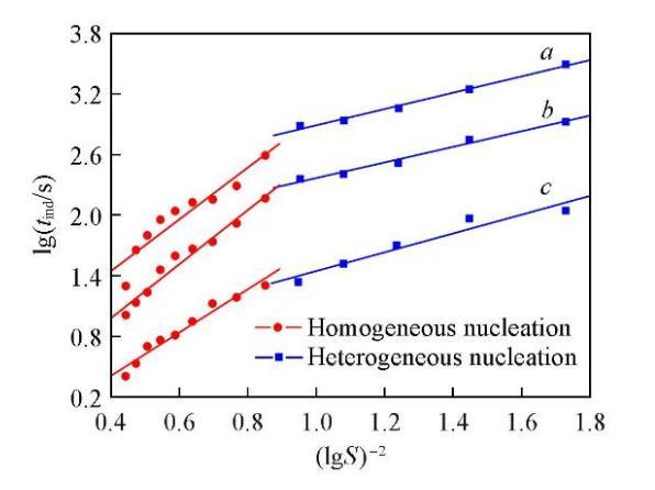 誘導(dǎo)期與初始過飽和度之間存在著很強(qiáng)的依賴關(guān)系.當(dāng)初始過飽和度足夠高時(shí),成核可認(rèn)為是均相的;當(dāng)初始過飽和度足夠低時(shí),成核則以非均相為主[37].在恒定溫度下,由晶體成核過程中的lgtind對(duì)(lgS)?2作圖可得兩條斜率不同的直線,分別對(duì)應(yīng)著兩種不同的成核機(jī)制,即初級(jí)均相成核和初級(jí)非均相成核[37].由不同溫度時(shí)Li2CO3的lgtind對(duì)(lgS)?2作圖,結(jié)果如圖3所示.可知,成核機(jī)制的變化引起了直線斜率的改變,均相成核對(duì)應(yīng)的直線斜率明顯大于非均相成核時(shí)的直線斜率(Bhom>Bhet).在較低的過飽和度時(shí),成核以非均相成核為主;而過飽和度增大到12.13以后,成核則以均相成核為主.