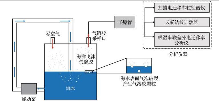 SSA生成裝置能夠在實驗室環(huán)境中模擬自然海洋系統(tǒng),實現(xiàn)在受控條件下從天然海水中產(chǎn)生SSA,并結(jié)合儀器表征顆粒的粒徑分布和理化特性。目前常用的模擬裝置有鼓泡式發(fā)生器、射流式發(fā)生器及波浪破碎式發(fā)生器等。本文以射流式SSA發(fā)生器為例,介紹SSA的生成原理(圖2)。通常來說,發(fā)生器都具有進水口、進氣口和采樣口。利用蠕動泵將海水從發(fā)生器底部周期性循環(huán)到頂部噴嘴,形成一個俯沖射流水柱,撞擊水面并將空氣夾帶進入海水中,在水下一定深度產(chǎn)生氣泡羽流。當氣泡上升到水氣界面并破裂時,產(chǎn)生SSA顆粒。采用潔凈零空氣作為載氣,將生成的SSA顆粒通過氣溶膠采樣口進行采集,連接干燥管進行干燥。此后,使用掃描電遷移率粒徑譜儀測量SSA的粒徑分布和數(shù)濃度等。該裝置可連接其他儀器,如CCN計數(shù)器和吸濕串聯(lián)差分電遷移率分析儀等進行CCN活性及吸濕性等的表征。