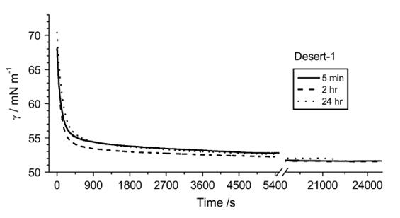 應(yīng)用EZ-PIplus表面張力儀">表面張力儀測試不同時(shí)間浸潤土壤后得到的土壤浸潤液的動(dòng)態(tài)表面張力。