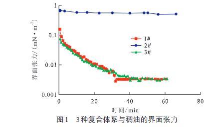 在比較3種復(fù)合體系驅(qū)油特征之前,應(yīng)確定其能否滿足超低界面張力和良好乳化性能的基本設(shè)計要求。因此,首先針對選用的復(fù)合體系,測試其與稠油的界面張力(圖1)。1#超低界面張力復(fù)合體系和3#雙效復(fù)合體系與稠油的界面張力均能達(dá)到超低水平,為3.0×10-3mN/m;而2#乳化復(fù)合體系與稠油的界面張力為5.1×10-1mN/m。3種復(fù)合體系與稠油的界面張力表現(xiàn)出顯著的不同,符合進一步驅(qū)油對比的需要。此外,盡管超低界面張力有利于減小毛細(xì)管力和稠油在巖石壁面的黏附功,但是對于稠油復(fù)合驅(qū),乳化降黏機理極為關(guān)鍵,需進一步對3種復(fù)合體系的乳化性能加以研究。