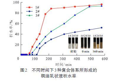 圖2不同時間下3種復(fù)合體系所形成的稠油乳狀液析水率