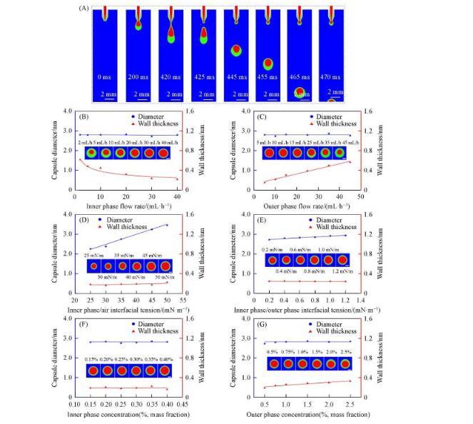 數(shù)值模擬與實驗結(jié)果具有較好的一致性,數(shù)值模擬內(nèi)相/外相流速對水/水微囊直徑和壁厚的影響,得出了與實驗數(shù)據(jù)一致的規(guī)律,即水/水微囊的直徑基本不隨內(nèi)相/外相流速的變化而變化,而水/水微囊壁厚隨內(nèi)相流速增加或外相流速減小都將減小,如圖4(B)和(C)所示。與實驗相比,數(shù)值模擬可以更系統(tǒng)地調(diào)節(jié)各個參數(shù),如外相/空氣界面張力、內(nèi)相/外相界面張力對微囊直徑和壁厚的影響。隨著外相/空氣界面張力的增加,水/水微囊直徑成比例增加,這是由于外相/空氣界面張力使微囊懸掛在管口,重力使微囊脫離管口,當外相/空氣界面張力增加,需要的重力相應增加,造成水/水微囊直徑增加。當內(nèi)相/外相界面張力增大時,水/水微囊直徑略有增加。