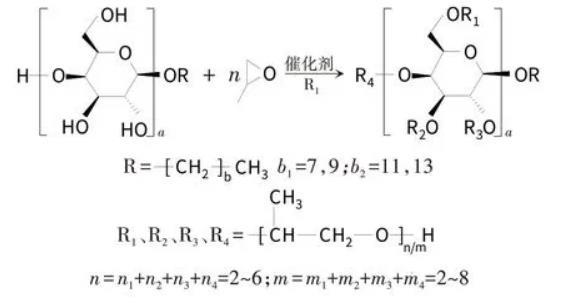 制備路線:烷基糖苷分子中含4個(gè)羥基,與環(huán)氧丙烷在催化劑作用下發(fā)生反應(yīng):