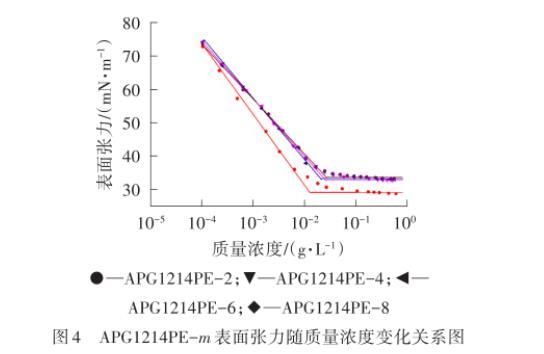 圖3 APG1214PE-m和APG1214表面張力隨質(zhì)量濃度變化關(guān)系圖