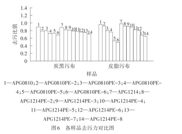 污垢通過不同的相互作用力在物品表面附著,而應(yīng)用表面活性劑去除的污垢一般是通過物理吸附(范德華力、偶極相互作用)或者靜電作用而附著于物品上。去污力是指將固體表面浸泡在一定的液體介質(zhì)中去除污垢的能力,使用洗滌劑減少污垢在固體表面的附著量,利用機(jī)械力使污垢與固體表面分離。由圖6可以看出,無論是皮脂污布還是炭黑污布,制備的APG0810PE-n和APG1214PE-m的去污比值都低于對(duì)應(yīng)的原料APG0810和APG1214,而且隨著PO加合數(shù)的增加而降低,可能是由于PO基團(tuán)的引入使得分子的疏水性提高。但整體來看,PO改性APG獲得的產(chǎn)品去污性能仍處于較好的水平。
