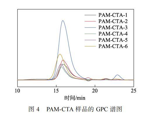 從表1可知,隨著DBTTC用量的降低,共聚物相對(duì)分子質(zhì)量逐漸增加,重均相對(duì)分子質(zhì)量(Mw)由5755增加到10505。這是因?yàn)椋S著鏈轉(zhuǎn)移劑DBTTC用量的增加,反應(yīng)體系中DBTTC的濃度增加,鏈增長(zhǎng)自由基與鏈轉(zhuǎn)移劑DBTTC反應(yīng)生成休眠中間體,鏈增長(zhǎng)停止,PAM-CTA的相對(duì)分子質(zhì)量隨著鏈轉(zhuǎn)移劑用量的增加而降低,實(shí)現(xiàn)對(duì)PAM-CTA相對(duì)分子質(zhì)量的可控合成。由于PAM-CTA-4的分子量分布最窄,因此,選擇PAM-CTA-4進(jìn)行下一步反應(yīng)。