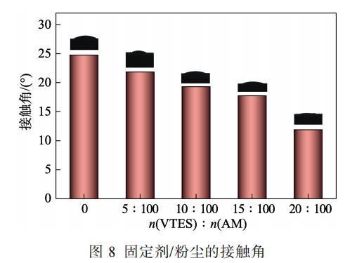 由圖8可知,共聚物水溶液與PTI-A2粉塵的接觸角均<90°,隨著VTES用量的增大,固定劑與PTI-A2粉塵片的接觸角逐漸減小。當(dāng)n(VTES)∶n(AM)由0增加到20∶100時(shí),接觸角從24.8°降低至11.9°,主要是因?yàn)閂TES用量的增加賦予了共聚物水溶液更低的表面張力,而PTI-A2粉塵具有較高的表面張力,因而接觸角越來(lái)越小。固定劑與粉塵片的接觸角越小,表明固定劑能更好地潤(rùn)濕氣溶膠粉塵顆粒,在空氣中固定劑與氣溶膠粉塵顆粒能更好地粘附。