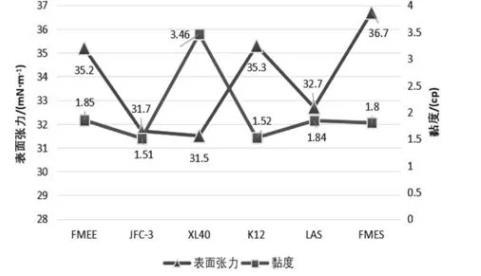 對比圖2中不同種類活性劑溶液的表面張力和黏度可以得出,F(xiàn)MES的表面張力數(shù)值最高(36.7mN·m-1),XL40的黏度數(shù)值最高(3.46cp),可見這兩種活性劑都不是最優(yōu)的表面活性劑。活性劑FMEE與K12的表面張力數(shù)值相近,僅差了0.1mN·m-1,但其溶液的表面張力較高,無法滿足條件要求。活性劑XL40的表面張力最低,僅為31.5mN·m-1,但由于其黏度最高為3.46cp,綜合來說效果不佳。綜合表面張力與黏度雙重作用效果,活性劑JFC-3與其他活性劑相比占有明顯優(yōu)勢,故選擇非離子表面活性劑JFC-3進行后續(xù)研究。