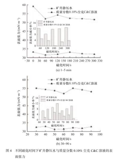 圖4不同磁化時(shí)間下礦井靜壓水與質(zhì)量分?jǐn)?shù)0.10%塵克C&C溶液的表面張力
