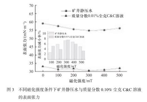 圖3不同磁化強(qiáng)度條件下礦井靜壓水與質(zhì)量分?jǐn)?shù)0.10%塵克C&C溶液的表面張力