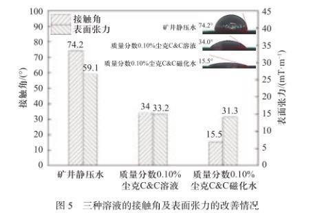 質(zhì)量分?jǐn)?shù)0.10%塵克C&C溶液的表面張力為33.2 mN/m.相較于礦井靜壓水,其表面張力減小了43.82%.質(zhì)量分?jǐn)?shù)0.10%塵克C&C磁化水的表面張力為31.3 mN/m.相較于礦井靜壓水,其接觸角減小了47.04%.由此可以看出,塵克C&C試劑和磁化相結(jié)合可更好地降低溶液的氣~液界面張力,使得溶液與低水分無煙煤顆粒接觸時(shí),更容易排出固~氣~液三相界面的氣體,以減弱其濕潤阻力。