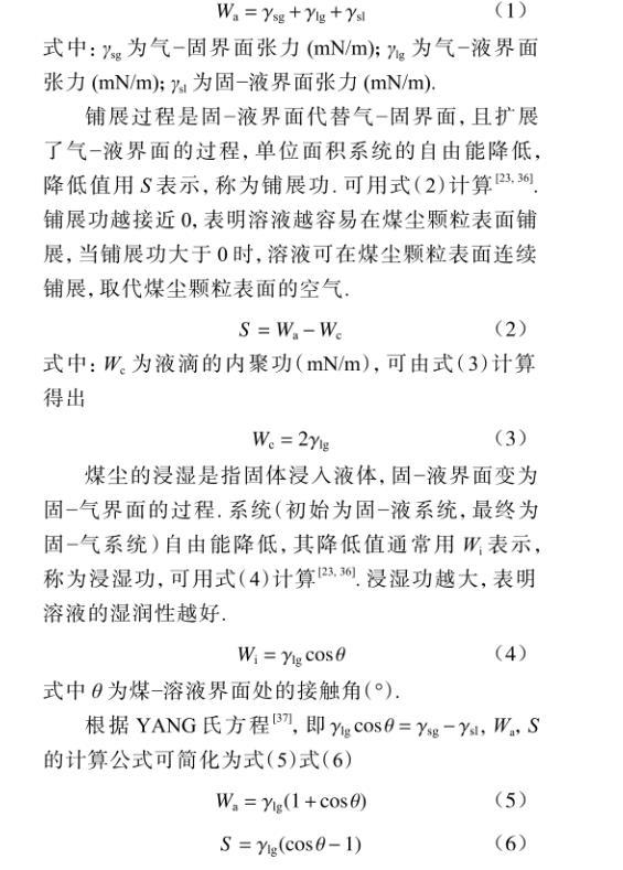 鋪展過程是固~液界面代替氣~固界面,且擴(kuò)展了氣~液界面的過程,單位面積系統(tǒng)的自由能降低,降低值用S表示,稱為鋪展功。可用式(2)計(jì)算。鋪展功越接近0,表明溶液越容易在煤塵顆粒表面鋪展,當(dāng)鋪展功大于0時(shí),溶液可在煤塵顆粒表面連續(xù)鋪展,取代煤塵顆粒表面的空氣。