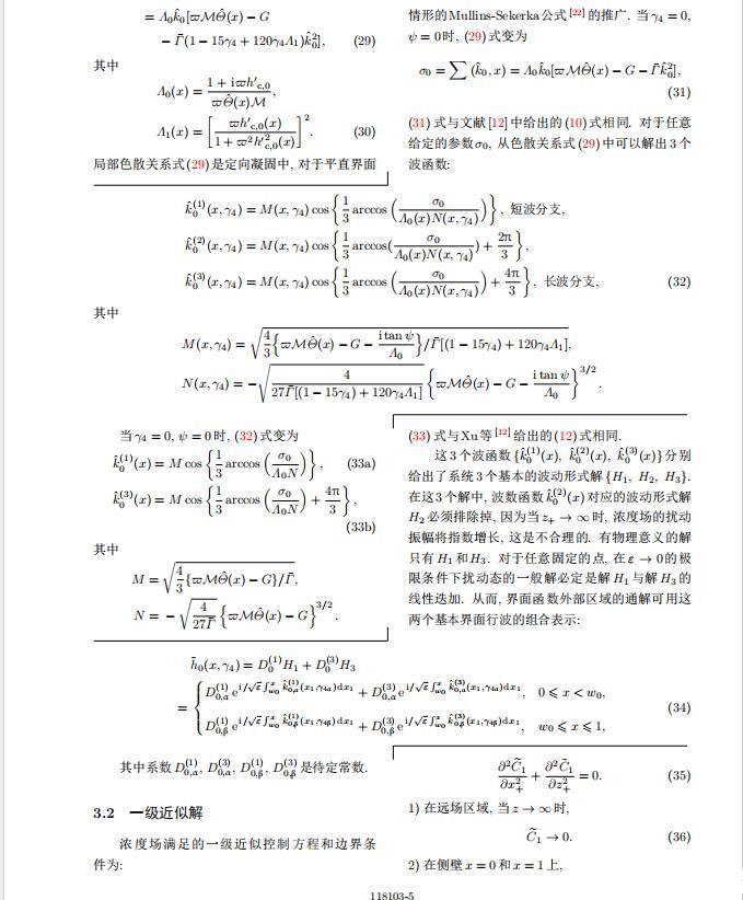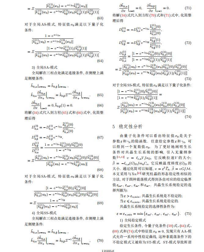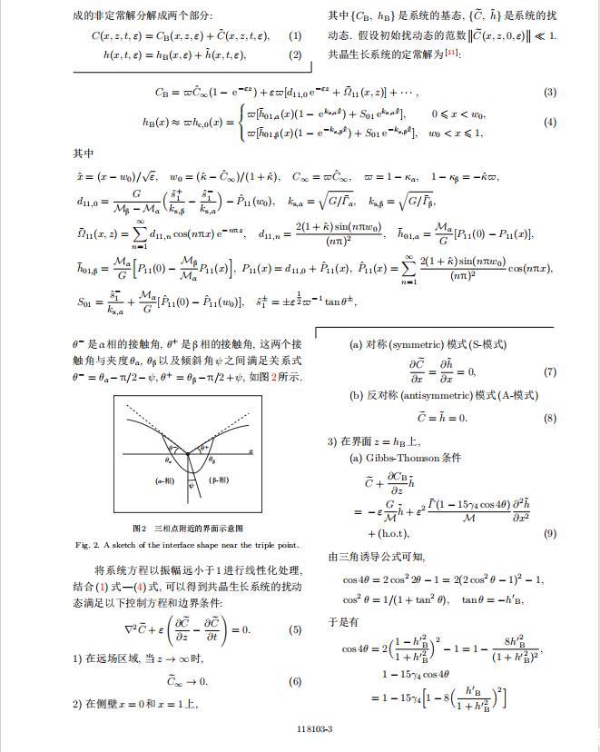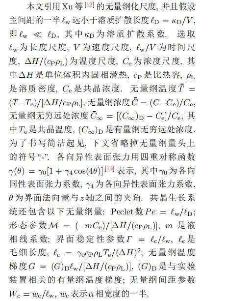 為考察共晶生長形態(tài)穩(wěn)定性,利用共晶生長的定常解作為基態(tài)進(jìn)行穩(wěn)定性分析.在初始時(shí)刻t=0時(shí)對基態(tài)解做一小擾動(dòng),并將在t&gt;0以后形成的非定常解分解成兩個(gè)部分: