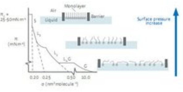 在進行典型的等溫壓縮測試時,單分子層先從二維的氣相(G)轉(zhuǎn)變到液相(L)最后形成有序的固相(S)。在氣相中,分子間的相互作用力比較弱;當表面積減小,分子間的堆積更為緊密,并開始發(fā)生相互作用;在固相時,分子的堆積是有序的,導致表面壓迅速增大。當表面壓達到最大值即塌縮點后,單分子層的堆積不再可控(圖1)。