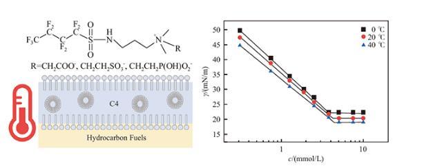 然而不同溫度對(duì)表面活性劑的性能可能有一定程度的影響。尤其是機(jī)場(chǎng)消防領(lǐng)域,由于我國(guó)機(jī)場(chǎng)分布較廣,消防車滅火需要就近取水,各機(jī)場(chǎng)在冬季和夏季的消防用水水源溫度差異較大(一般在0~40℃)。在低溫下氟碳表面活性劑的性能可能會(huì)受到影響,進(jìn)而影響AFFF的滅火性能。我國(guó)國(guó)標(biāo)中也僅對(duì)泡沫在室溫下的性能指標(biāo)有所要求,并未嚴(yán)格考慮溫度的影響。因此,將溫度作為影響因素進(jìn)行研究,能夠指導(dǎo)表面活性劑的有效應(yīng)用。本文在溫度為0~40℃的范圍下,研究三種接枝不同親水基團(tuán)的基于短碳氟鏈的甜菜堿型兩性氟表面活性劑的一系列理化性質(zhì),為此類表面活性劑在不同溫度環(huán)境下的應(yīng)用提供理論依據(jù)。
