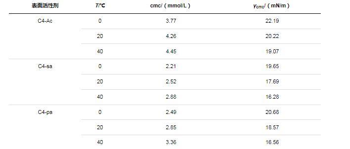 總體而言,溫度對(duì)甜菜堿氟碳表面活性劑的cmc影響較小。此外,在0~40℃的溫度范圍內(nèi),對(duì)比三種表面活性劑的表面活性參數(shù)可知,cmc值均小于4.45 mmol/L,γcmc均小于22.19 mN/m。親水端官能團(tuán)的不同對(duì)表面活性劑的性能具有一定的影響,當(dāng)溶液濃度足夠大時(shí),C4-Ac的表面張力相對(duì)較高,C4-sa和C4-pa具有較低的表面張力,后者略高于前者,并且C4-sa和C4-pa的cmc值低于C4-Ac。因?yàn)閺姆肿咏Y(jié)構(gòu)上來(lái)看,C4-Ac比C4-sa和C4-pa少一個(gè)有效碳,因此前者的疏水性要略弱于后二者,可以解釋表面張力和cmc的相對(duì)大小。