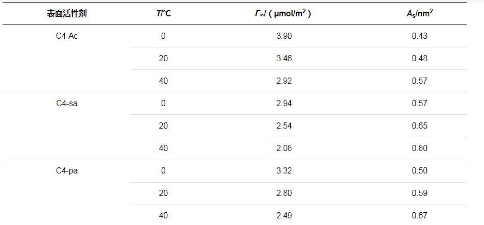 通常較高的Γ∞和較低的AS值表明表面活性劑分子密集地排列在空氣與水的界面上,由上述公式計(jì)算得到三種表面活性劑的Γ∞和較低的AS值如表2所示。對(duì)比參數(shù)可知,同種表面活性劑的Γ∞均隨溫度的升高而減小,AS有所增大,吸附表面的分子排布較為松散。這是由于溫度較高的情況下表面活性劑分子熱運(yùn)動(dòng)加劇,更易從吸附界面上脫離,并且因無(wú)規(guī)則運(yùn)動(dòng)導(dǎo)致吸附分子所占面積增大了。溫度升高導(dǎo)致溶解度的增加,因而表面的Γ∞會(huì)有所減小。由于Γ∞還受到表面張力隨濃度變化曲線斜率的影響,因此所得趨勢(shì)是綜合影響的結(jié)果。此外,由表中還可以看出,C4-sa分子的Γ∞最小,AS最大,在溶液表面的排列更加松散。這可能是由于親水端磺酸基團(tuán)之間強(qiáng)靜電排斥力,并且空間位阻較大。