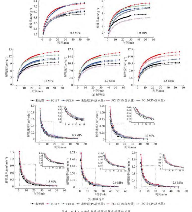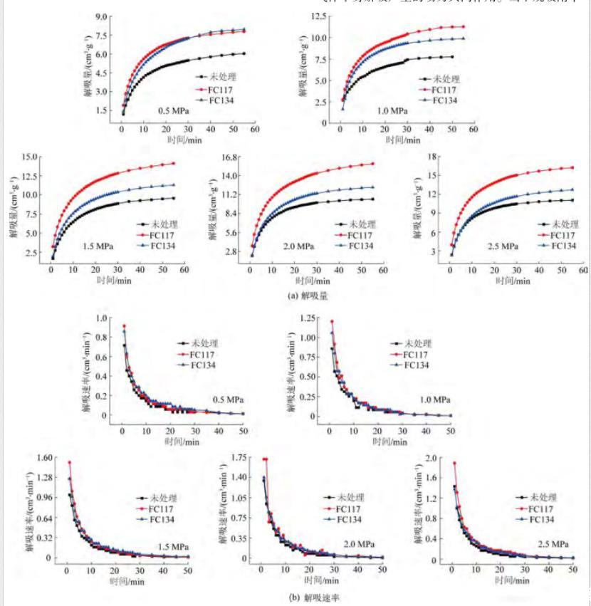 由圖6b可知,隨著甲烷吸附平衡壓力的增加,3種處理方式的含水煤樣解吸速率均有所增加。經(jīng)過氣潤濕反轉(zhuǎn)劑FC117和FC134處理后的煤樣解吸速率也始終大于未處理的煤樣。其中,表面活性劑FC117處理后的煤樣解吸速率始終保持著顯著的效果。同時,由于水鎖效應(yīng)產(chǎn)生的影響,不同處理方式的含水煤樣解吸速率均小于干燥煤樣的解吸速率。
