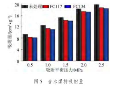 3)通過對氣潤濕反轉(zhuǎn)劑處理前后煤樣吸附量的計算,對比兩種表面活性劑處理前后的煤樣吸附量變化情況。其中,經(jīng)過FC117和FC134處理后的干燥/含水煤樣均小于未處理煤樣的吸附量。