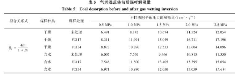 4)對經(jīng)過FC117和FC134處理后的干燥/含水煤樣進行解吸量和解吸速率的測定,兩種表面活性劑處理后煤樣的解吸效果均有顯著的效果。在氣潤濕反轉(zhuǎn)劑處理后的煤樣吸附量小于未處理的,而解吸量和解吸速率大于未處理的,則表明氣潤濕反轉(zhuǎn)劑處理后的煤樣可以消除水鎖效應(yīng),增加解吸率,提高解吸效果。