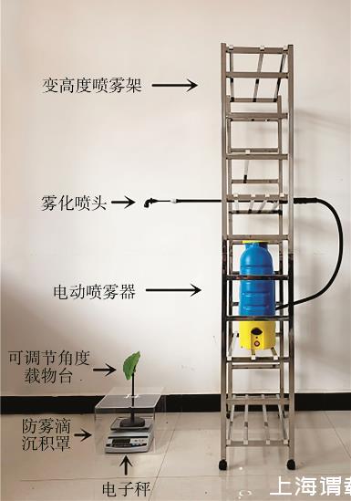 流失點(diǎn)和最大穩(wěn)定持留量的測定裝置見圖2。將噴霧器固定在可變高度噴霧架上,噴頭與地面垂直,分別設(shè)置噴嘴下沿與葉片中心垂直距離50、100、150和200 cm 4種噴霧距離,噴霧器中裝入水,進(jìn)行噴霧時(shí)關(guān)閉靜電功能。測定裝置由載物臺(tái)、電子秤和防霧滴沉積罩3部分組成。其中載物臺(tái)可進(jìn)行90°以內(nèi)的傾斜角度調(diào)整;電子秤精度為0.01 g(YH-50002型,東陽市英衡智能設(shè)備有限公司);防護(hù)罩為透明的亞克力材料制成,防止霧滴沉積到電子秤上。
