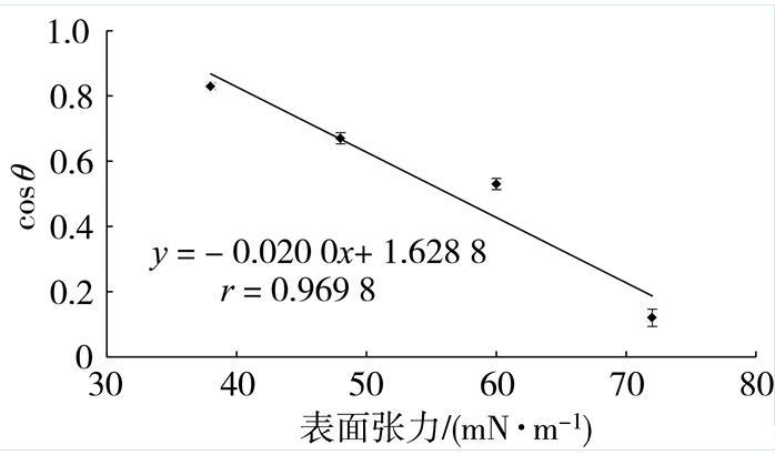 葉片臨界表面張力直接影響藥液在葉片表面的沉積特性,臨界表面張力越小越不利于藥液霧滴的沉積、潤(rùn)濕和展布。測(cè)試液的表面張力與cosθ間呈顯著負(fù)相關(guān)關(guān)系(圖3),其擬合方程為y=0.020 0x+1.628 8(r=0.969 8),其中x為表面張力,y為cosθ。根據(jù)擬合方程計(jì)算得到煙草葉片的臨界表面張力為31.44 mN/m。與王亞虹等和陳海濤等測(cè)定的K326和云87兩個(gè)煙草品種相近,表明不同煙草品種葉片臨界表面張力值差異不大,且明顯低于小麥、棉花和茄子等,說(shuō)明普通農(nóng)藥?kù)F滴不容易在煙草葉片表面潤(rùn)濕和展布,因此需要合理使用助劑降低農(nóng)藥藥液的表面張力至低于煙草葉片臨界表面張力。