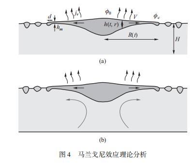 馬蘭戈尼效應(yīng)是指由于表面張力不同的二種液體的界面存在表面張力梯度而使質(zhì)量傳送的現(xiàn)象。出現(xiàn)馬蘭戈尼效應(yīng)的原因是表面張力大的液體對(duì)其周圍表面張力小的液體的拉力強(qiáng),產(chǎn)生表面張力梯度;使液體從表面張力低的方向向表面張力高的方向流動(dòng)。此時(shí)引入馬蘭戈尼效應(yīng),就是對(duì)前文所說理論的一個(gè)形象簡(jiǎn)潔的概括。當(dāng)酒精濃度超過某一閾值,液滴擴(kuò)散。酒精蒸發(fā)液滴外圍較薄的區(qū)域變得富含水,當(dāng)外圍局部濃度小于閾值,擴(kuò)散停止。空間上不均勻的混合物濃度產(chǎn)生沿液滴半徑的表面張力梯度,它們將溶質(zhì)從油滴中心向外驅(qū)動(dòng)。蒸發(fā)優(yōu)先消耗位于邊緣附近的液滴最薄部分的酒精,而乙醇含量的變化導(dǎo)致朝向液滴邊緣的界面張力增加。這些梯度會(huì)在混合空氣和混合油界面處產(chǎn)生馬蘭戈尼切向應(yīng)力,從而驅(qū)動(dòng)從液滴中心到外圍的徑向流動(dòng)。液滴邊緣脫濕和向外的馬蘭戈尼流動(dòng)效應(yīng)的結(jié)合導(dǎo)致液滴的外圍形成較厚的邊緣,從而變得不穩(wěn)定,分裂成無數(shù)的小液滴,產(chǎn)生液滴爆炸的物理現(xiàn)象。馬蘭戈尼效應(yīng)示意圖如圖4所示,黑箭頭代表蒸發(fā)量和厚度的徑向減小,灰色箭頭代表液滴中馬蘭戈尼應(yīng)力與油層中的黏性應(yīng)力平衡,導(dǎo)致大量流動(dòng)。h(r,t)是液滴的厚度剖面,R(t)是中心液滴的半徑,H是油面厚度。