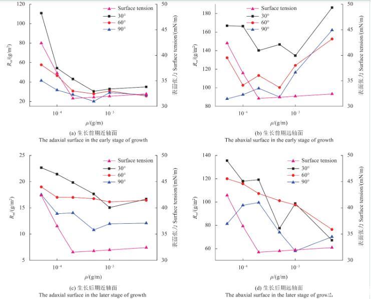 圖6為不同濃度SilwetL-77溶液在蘋果葉片近、遠(yuǎn)軸面的Rm變化規(guī)律。由圖可知,當(dāng)溶液質(zhì)量濃度低于cmc時(shí),蘋果葉片生長前、后期遠(yuǎn)軸面的Rm值和表面張力均隨溶液質(zhì)量濃度的降低而減小。此外,蘋果葉片生長后期近軸面只有在30°傾角時(shí)的Rm值與表面張力隨溶液質(zhì)量濃度的提高而減小,60°傾角和90°傾角時(shí)Rm值隨溶液濃度變化不大。蘋果葉片生長后期遠(yuǎn)軸面Rm值和表面張力隨溶液濃度的變化與生長前期基本一致。