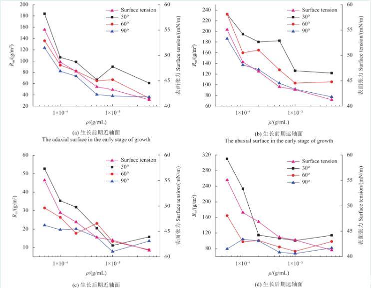 圖5為不同質(zhì)量濃度Triton X-100溶液在蘋果葉片近、遠(yuǎn)軸面的Rm變化規(guī)律。從中可以看出,不同傾角下蘋果葉片生長前期近、遠(yuǎn)軸面的Rm值和表面張力均隨溶液質(zhì)量濃度的升高而不斷減小,當(dāng)Triton X-100溶液質(zhì)量濃度達(dá)到cmc時(shí),近軸面Rm值與表面張力的變化趨于平緩,而遠(yuǎn)軸面的Rm值則出現(xiàn)大幅波動(dòng)。其原因可能與Triton X-100表面活性效率高(cmc=1.32×10?4 g/mL)有關(guān),同時(shí)溶液色散分量占比會(huì)隨溶液質(zhì)量濃度的升高而提高,而對(duì)蘋果葉片遠(yuǎn)軸面表面自由能起主導(dǎo)作用的也是色散分量,以上多重因素導(dǎo)致遠(yuǎn)軸面的Rm值產(chǎn)生波動(dòng)。蘋果葉片生長后期Rm與表面張力隨溶液質(zhì)量濃度的變化與生長前期相似。
