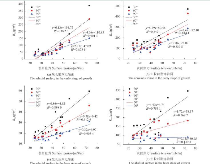 由表2結(jié)果可知,蘋果葉片生長(zhǎng)前期近、遠(yuǎn)軸面和生長(zhǎng)后期近軸面,不同葉傾角下表面張力與Rm值擬合曲線的R2均高于0.80。而蘋果葉片生長(zhǎng)后期遠(yuǎn)軸面除30°時(shí)R2高于0.7外,其他葉傾角下均低于0.6,且隨著葉傾角增大,R2不斷減小,這表明蘋果葉片生長(zhǎng)后期遠(yuǎn)軸面的表面張力與Rm值之間的線性關(guān)系較差。